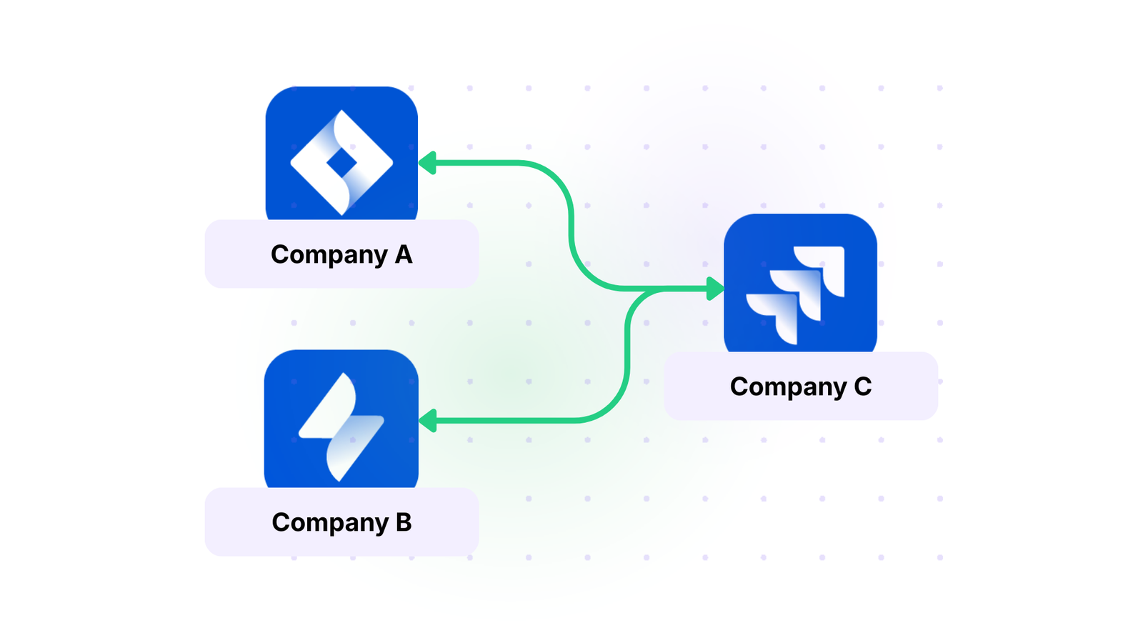 The Challenge: Complex business environments involve multiple companies and platforms. For example, a company using Jira Software syncs with another company using Jira Service Management. When they need to onboard a third party working with Jira on-premise, they need a solution that connects all three.