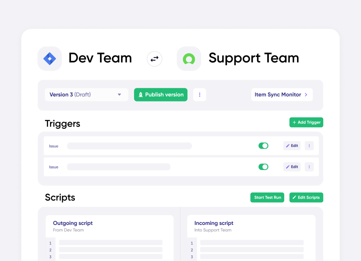 Exalate is flexible enough to cover almost all integration use cases through its Groovy-based scripting engine. You can start with basic sync scenarios out-of-the-box or implement advanced use cases using scripts. With Aida AI, you can prompt your requirements and let AI write the sync rules or customize them yourself. Sync any default or custom properties, set custom mappings, add advanced logic, and manage everything from a unified console.