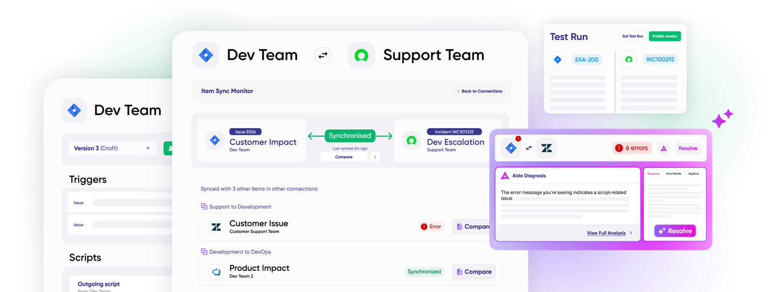 Keep everyone on the same page with instant updates between teams. Resolve tickets, bugs, and incidents faster with real-time sync.
