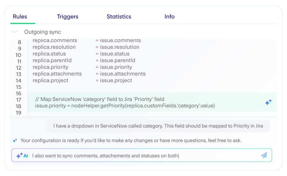 Configure your sync rules to make sure the right data is shared. Prompt the sync rules with Aida AI, or write your scripts from scratch.